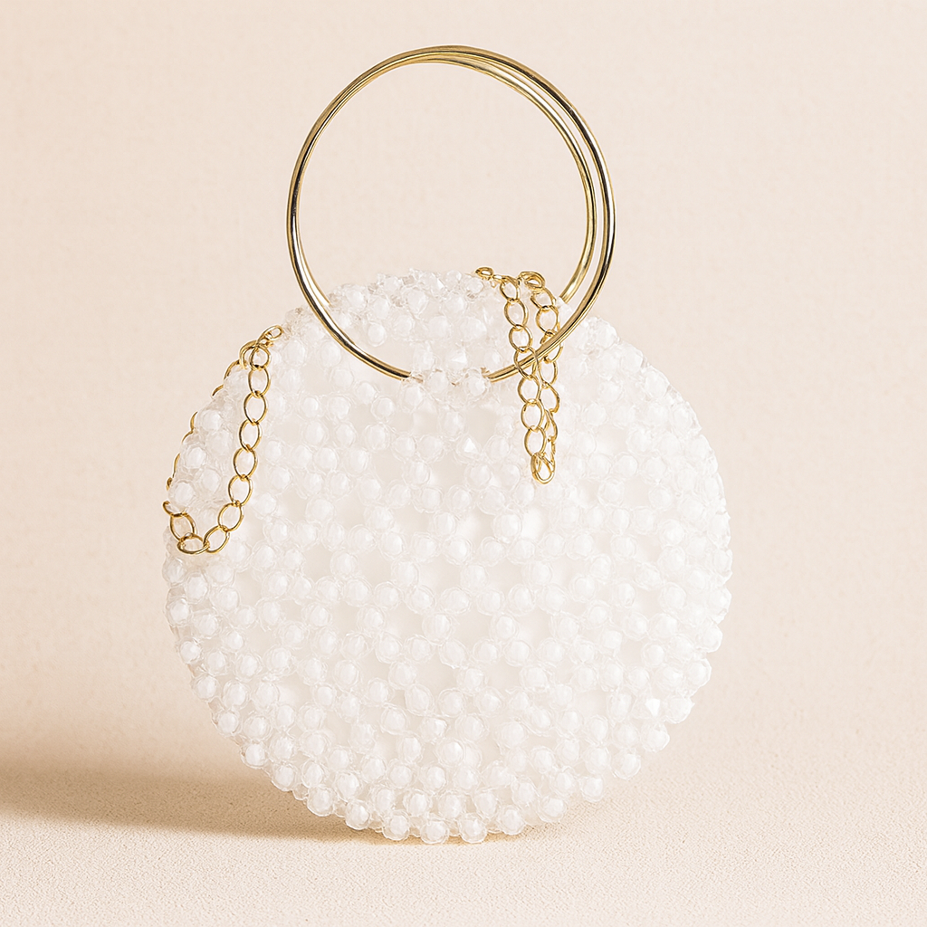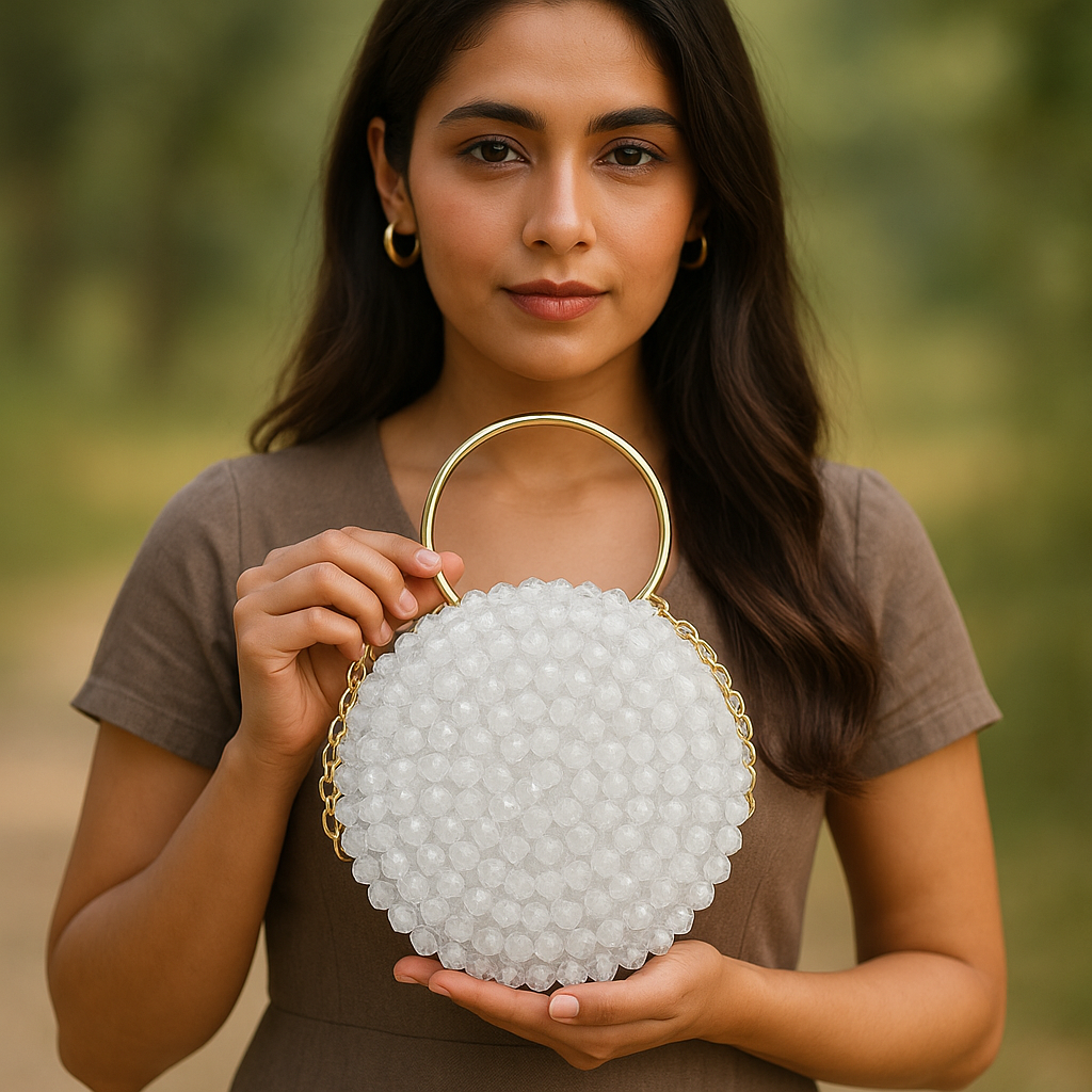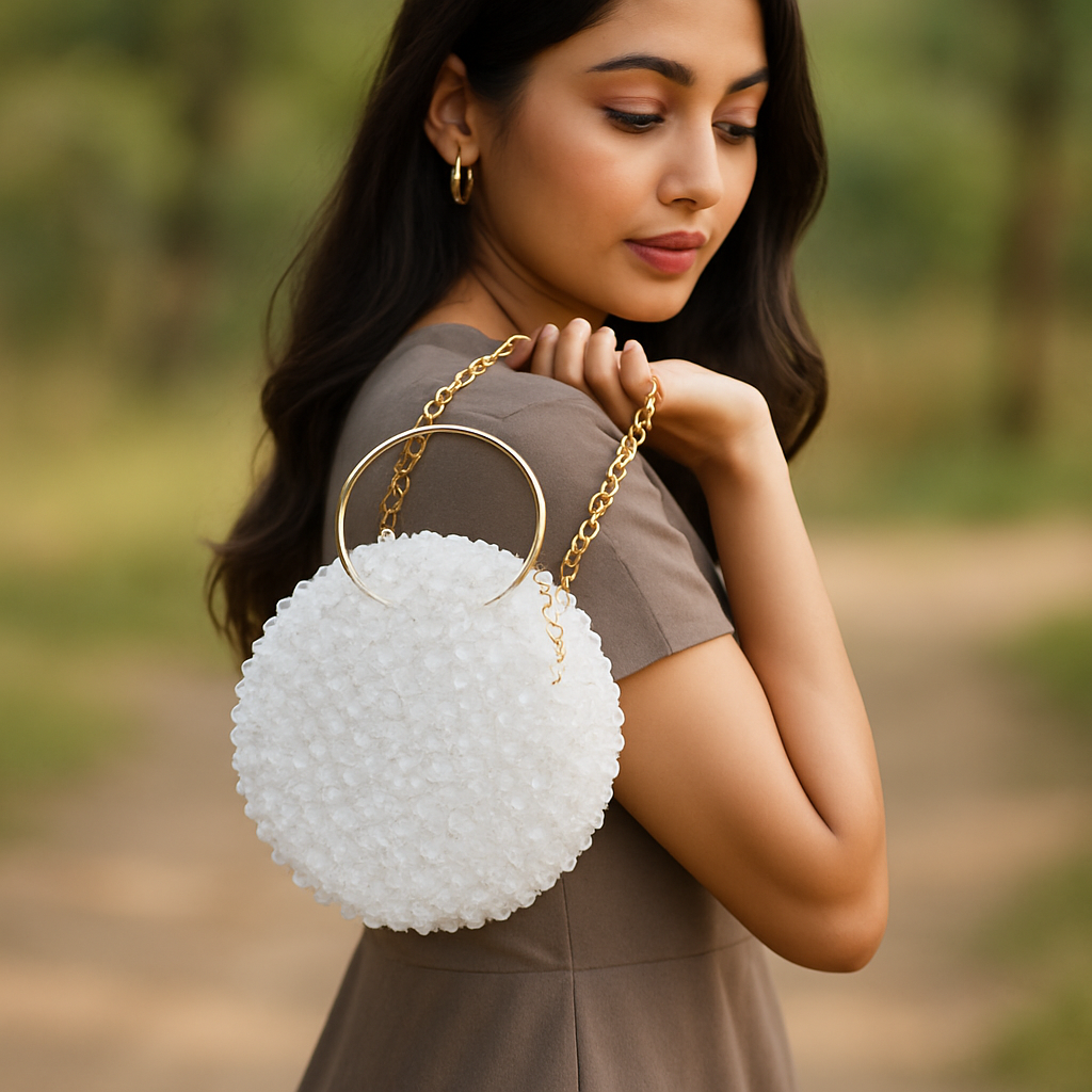 Handmade circular beaded handbag with glossy white beads and a chic gold chain. A perfect accessory for partywear, ethnic looks, and modern styling.