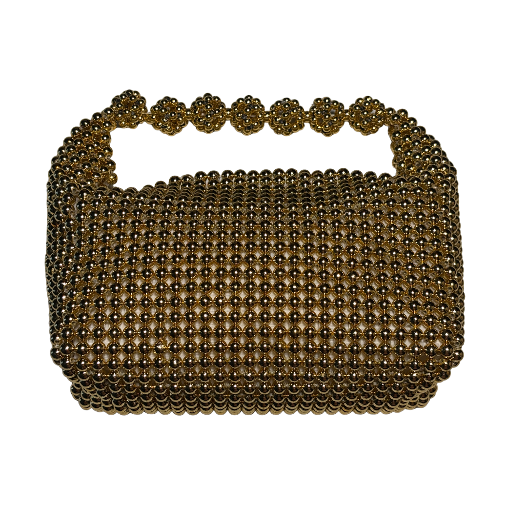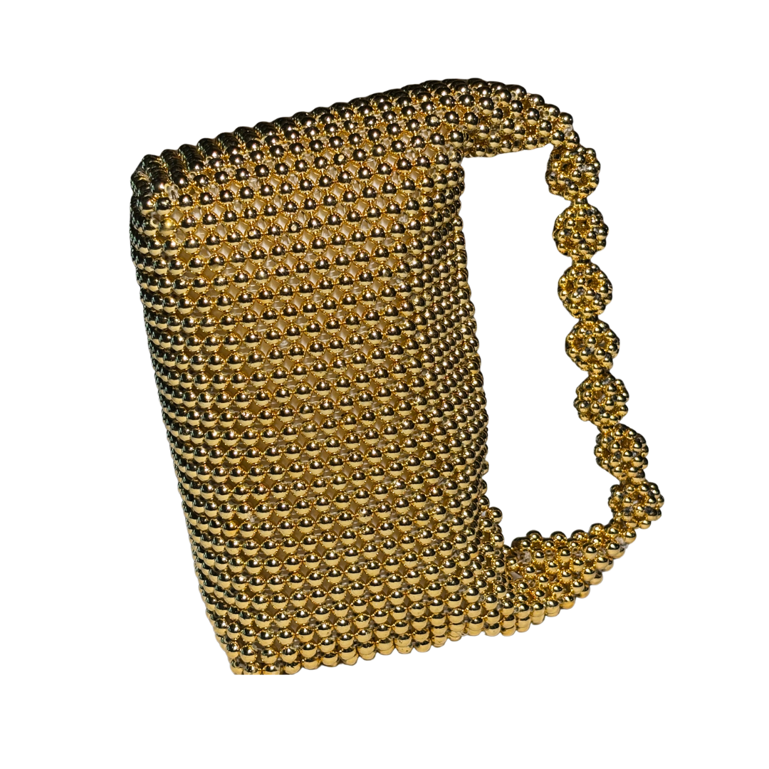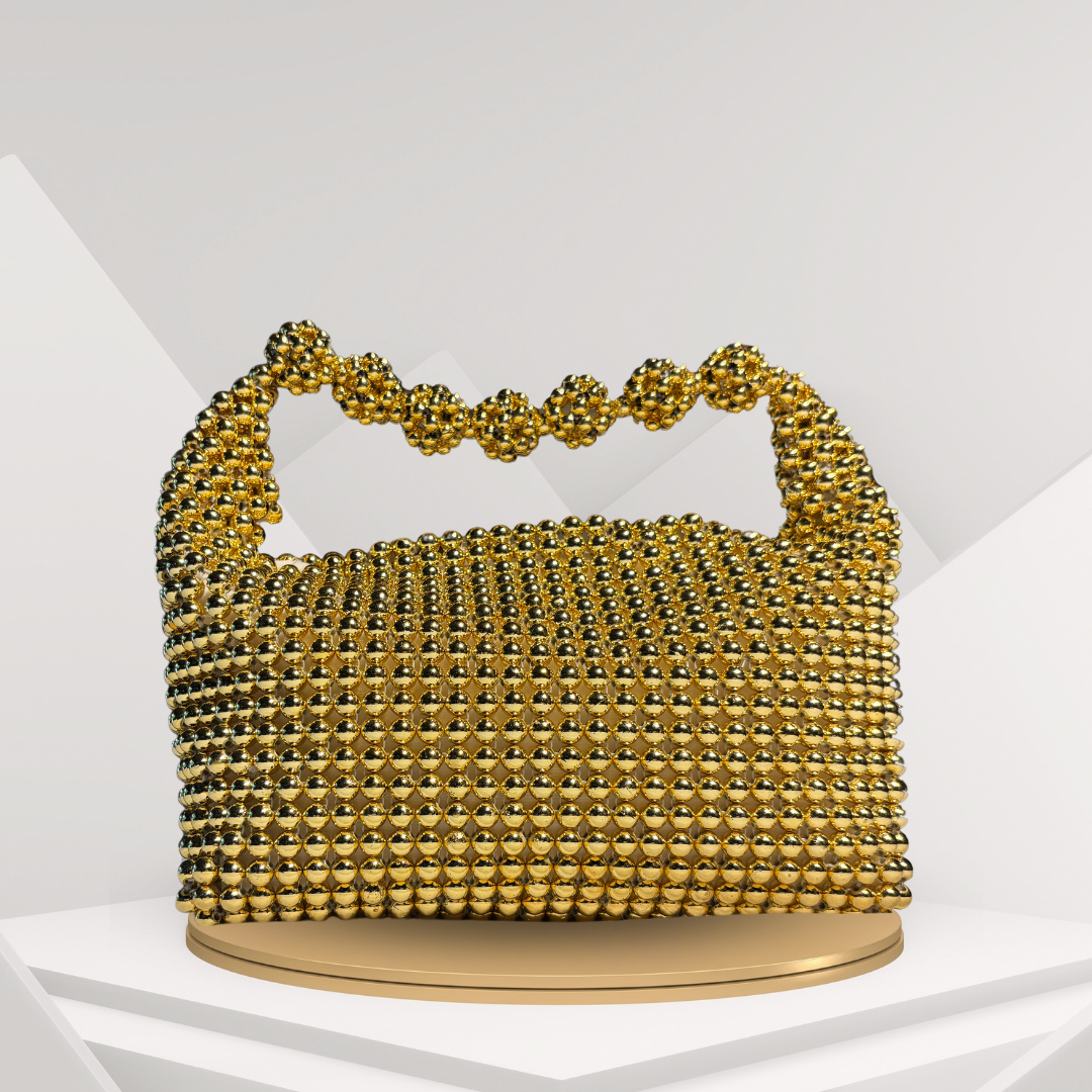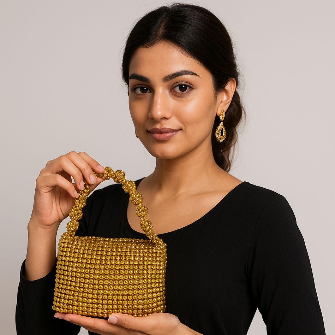 A luxurious handcrafted golden beaded handbag designed for weddings, parties, and festive occasions. Made with premium metallic beads and a stylish handle, offering durability, elegance, and functionality in one.