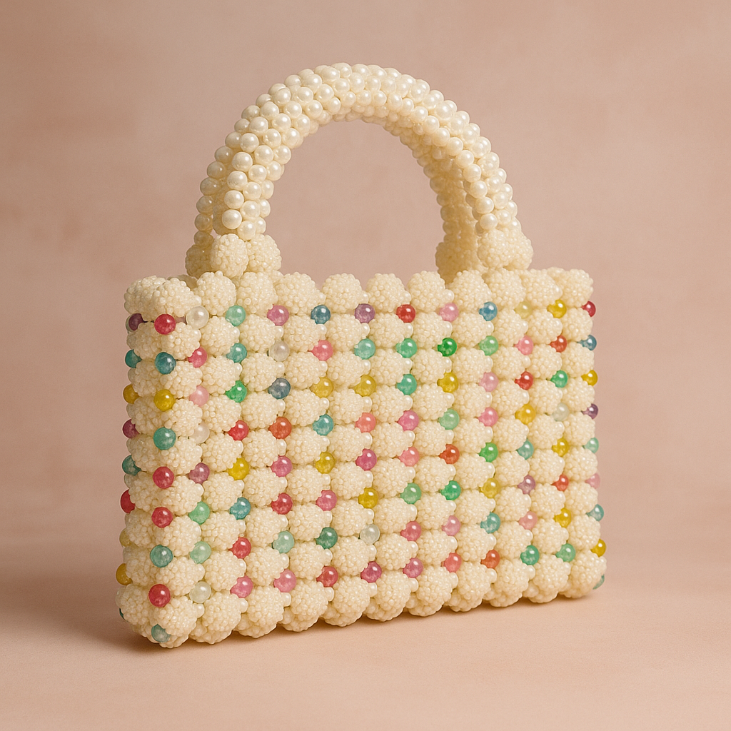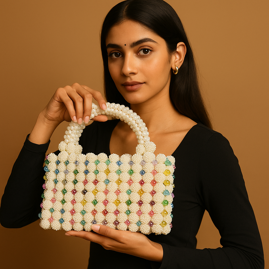 Measuring 8.5 × 3 × 5.5 inches, this beaded handbag is lightweight, durable, and perfect for pairing with ethnic outfits, western dresses, Indo-western wear, and bridal looks. Whether you’re styling for an event or gifting someone special, this multicolor pearl handbag delivers a classy, luxurious finish.