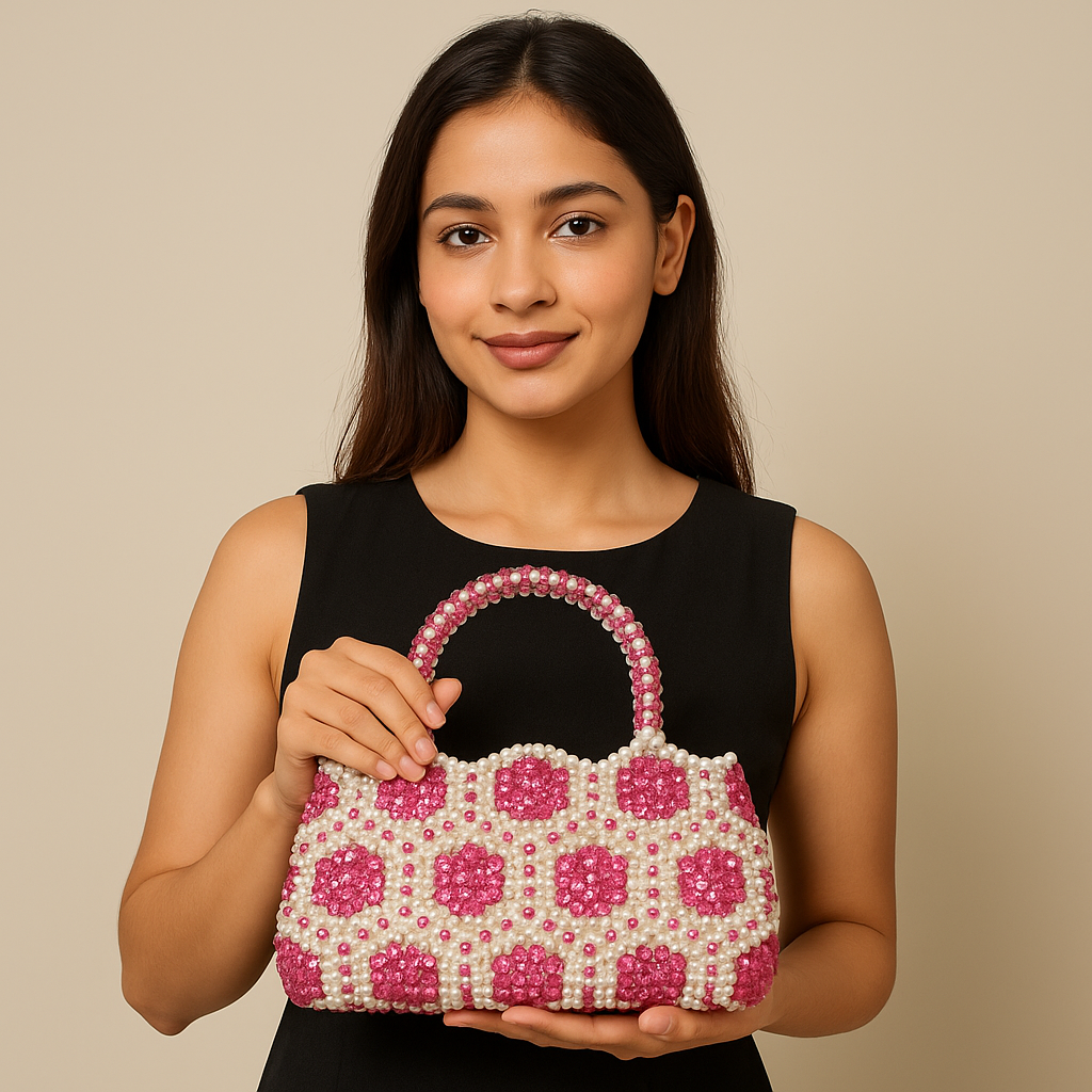 Pink & White Pearl Beaded Handbag – Handmade Crystal Bead Purse for Women