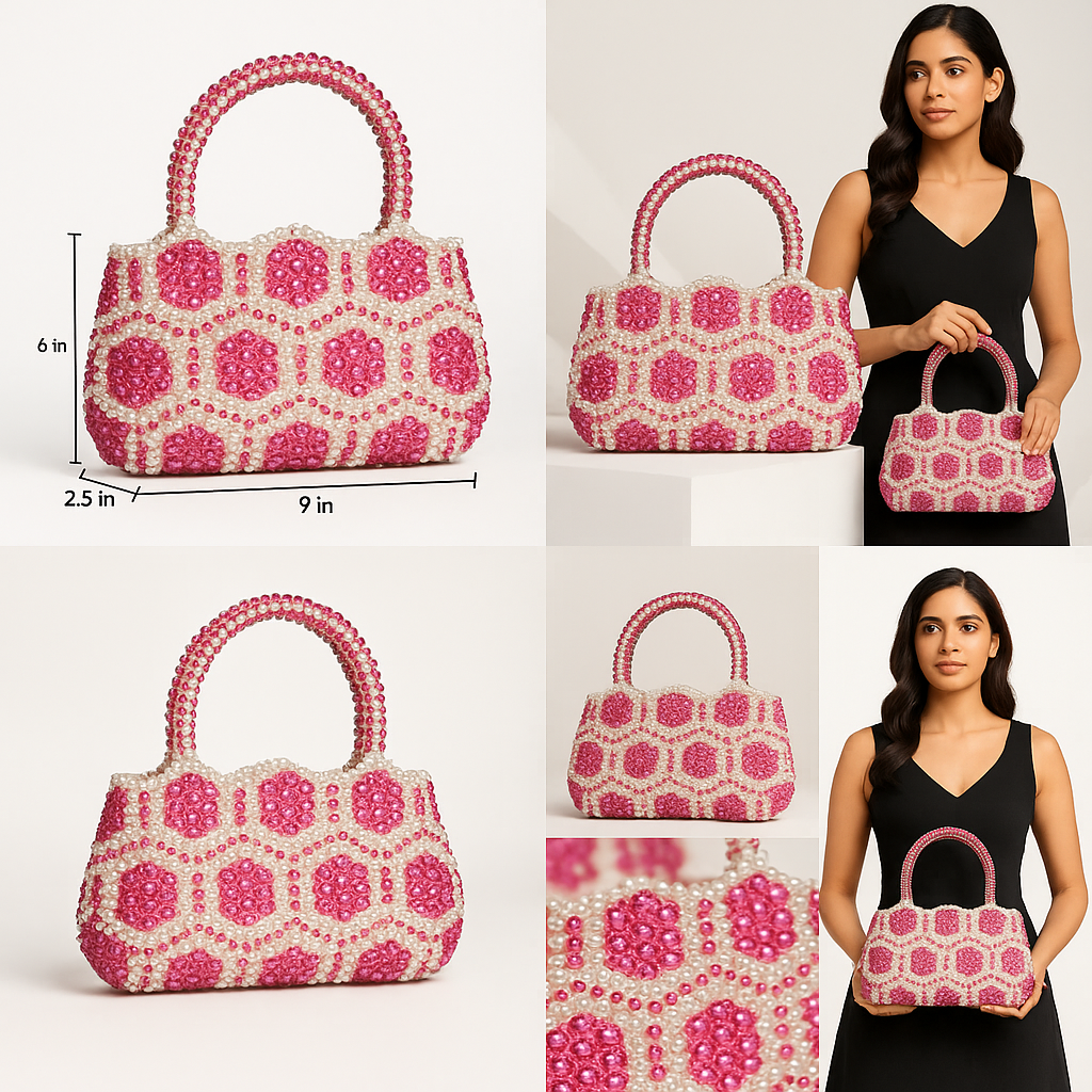 Be the first to review “Pink & White Pearl Beaded Handbag – Handmade Crystal Bead Purse for Women”